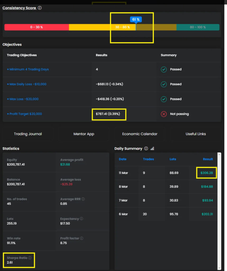 2024年3月12日 / 最終更新日時 : 2024年3月16日 financial-market-samurai FTMO Challenge March 11th (Monday)”Grades and Impressions” Propfirm March 11th (Monday) 本日の損益:$306.28 本日の増加損益:0.15% 年換算利回り:36.9% 現時点での損益:0.39% 資本:$200,787.41 Consistency Score:61% Sharp Ratio:2.61 Follow me! FacebookXCopy