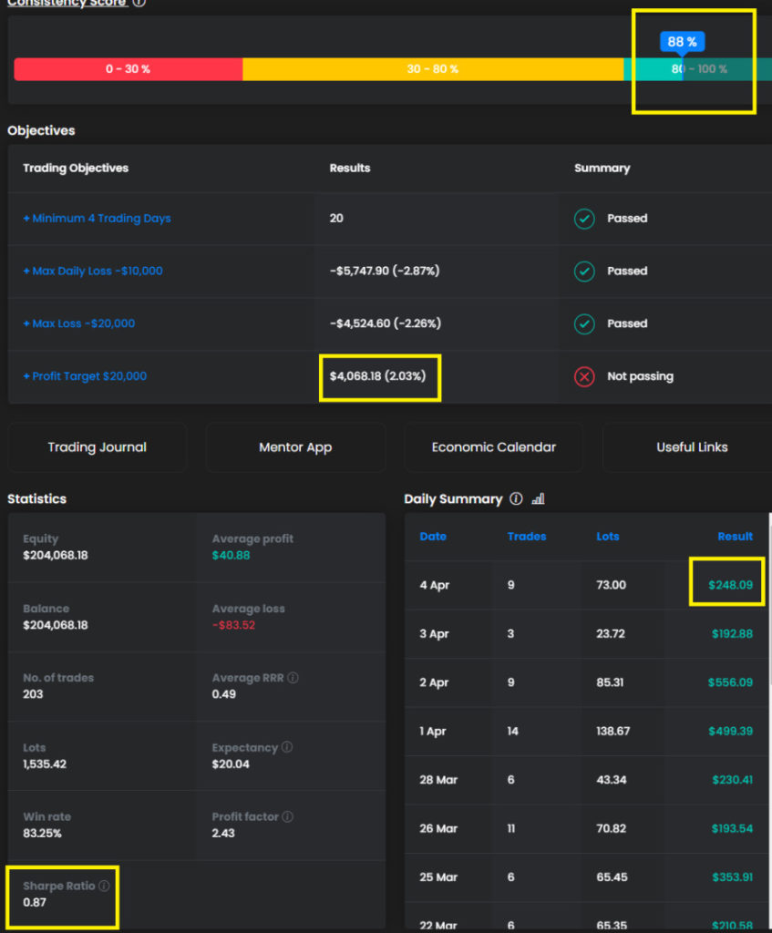 2024年4月16日 / 最終更新日時 : 2024年4月16日 financial-market-samurai FTMO Challenge April 4th, 2024(Thursday)Grades and Impressions Prop Firm April 4th, 2024(Thursday) 本日の損益:$248.09 本日の増加損益:0.12% 年換算利回り:29.52% 現時点での損益:2.03% 資本:$204,068.18 Consistency Score:88% Sharp Ratio:0.87 Follow me! FacebookXCopy