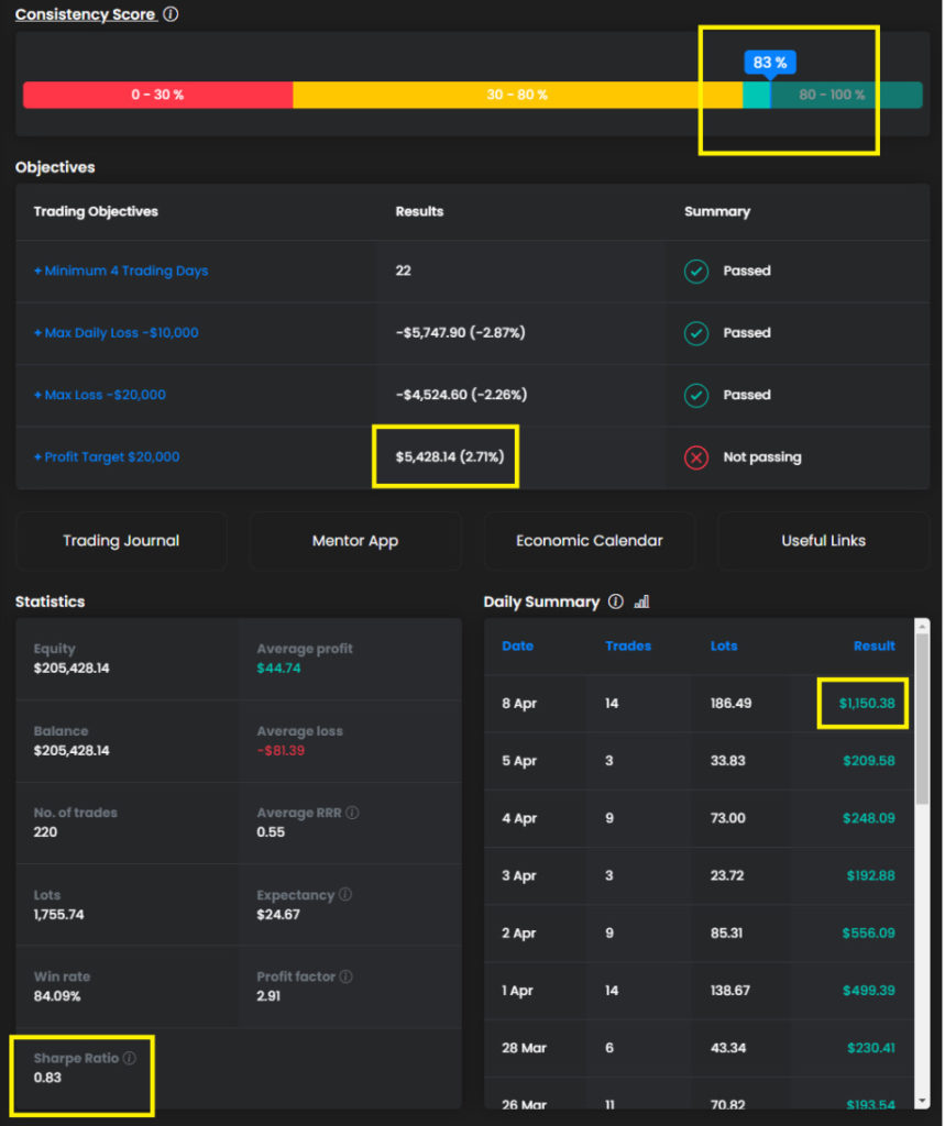 2024年4月16日 / 最終更新日時 : 2024年4月16日 financial-market-samurai FTMO Challenge April 8th, 2024(Monday)Grades and Impressions Prop Firm April 8th, 2024(Monday) 本日の損益:$1150.38 本日の増加損益:0.58% 年換算利回り:142.68% 現時点での損益:2.71% 資本:$205,428.14 Consistency Score:83% Sharp Ratio:0.83 Follow me! FacebookXCopy