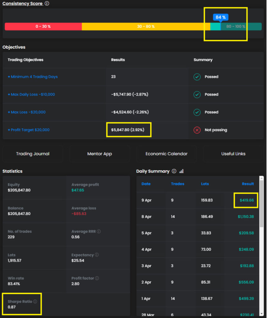 2024年4月16日 / 最終更新日時 : 2024年4月16日 financial-market-samurai FTMO Challenge April 9th, 2024(Tuesday)Grades and Impressions Prop Firm April 9th, 2024(Tuesday)Grades and Impressions 本日の損益:$419.66 本日の増加損益:0.21% 年換算利回り:51.66% 現時点での損益:2.92% 資本:$205,847.80 Consistency Score:84% Sharp Ratio:0.87 Follow me! FacebookXCopy