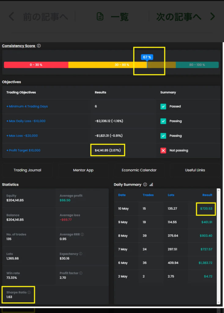 2024年5月12日 / 最終更新日時 : 2024年5月14日 financial-market-samurai FTMO Challenge May 10th, 2024(Friday)Grades and Impressions Prop trader May 10th, 2024(Friday) 本日の損益:$720.53 本日の増加損益 : 0.36% 年換算利回り : 88.56% 現時点での損益:2.07% 資本:$204,141.85 Consistency Score:67% Sharp Ratio:1.63 Follow me! FacebookXCopy
